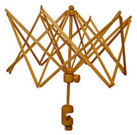 | Our wooden Umbrella Swift can handle skeins from 12" to 72". Made of polished birch, the only non-wood parts are brass rivets for the cross-sticks, waxed cord for stick ends, and steel wire at the spools.